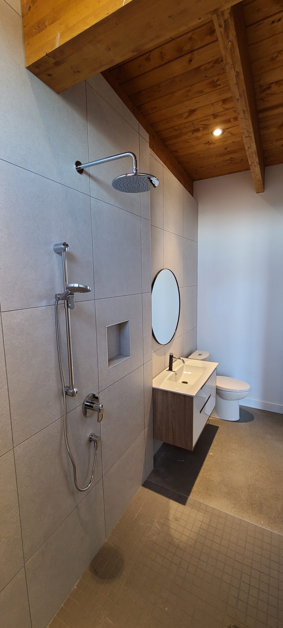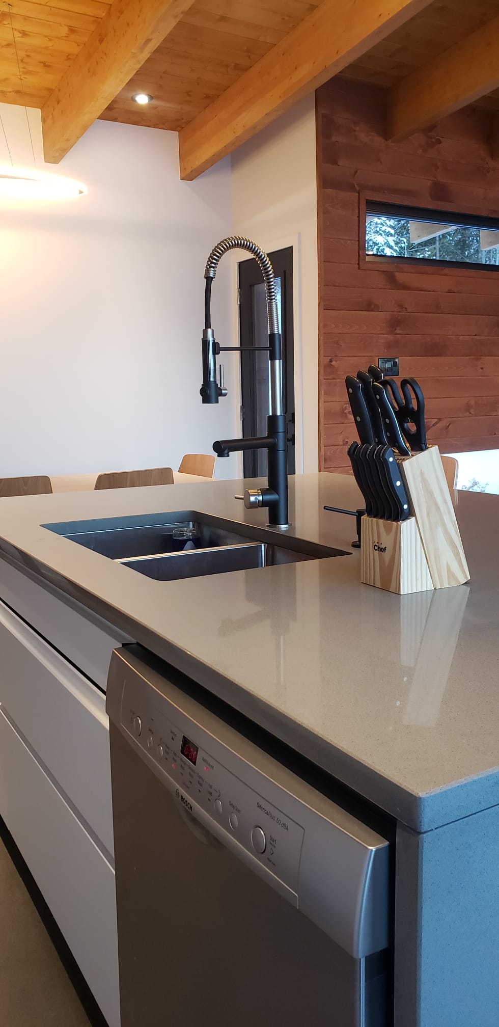 De part sa conception et sa position, la propriété reçoit la lumière naturelle avec sa fenestration abondante. Toutes les pièces de la propriété bénéficient d’une vue à 180 degrés sur les montagnes en face.