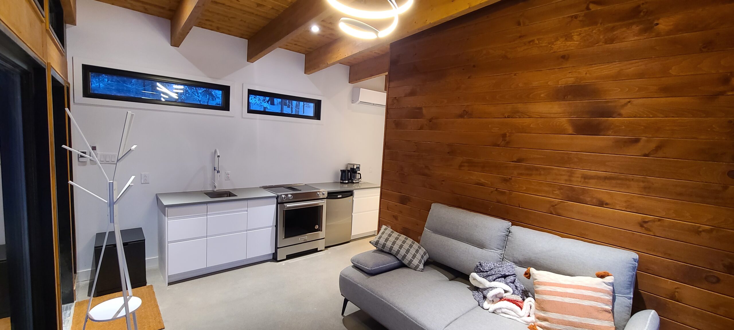 Pouvant accueillir jusqu'à 10 personnes, la propriété est composée de deux unités avec une terrasse (aire de détente) couverte disposant d’un foyer au bois. La propriété offre deux salons indépendants, deux cuisines indépendantes, trois chambres, trois salles de bain, et un coin bureau.